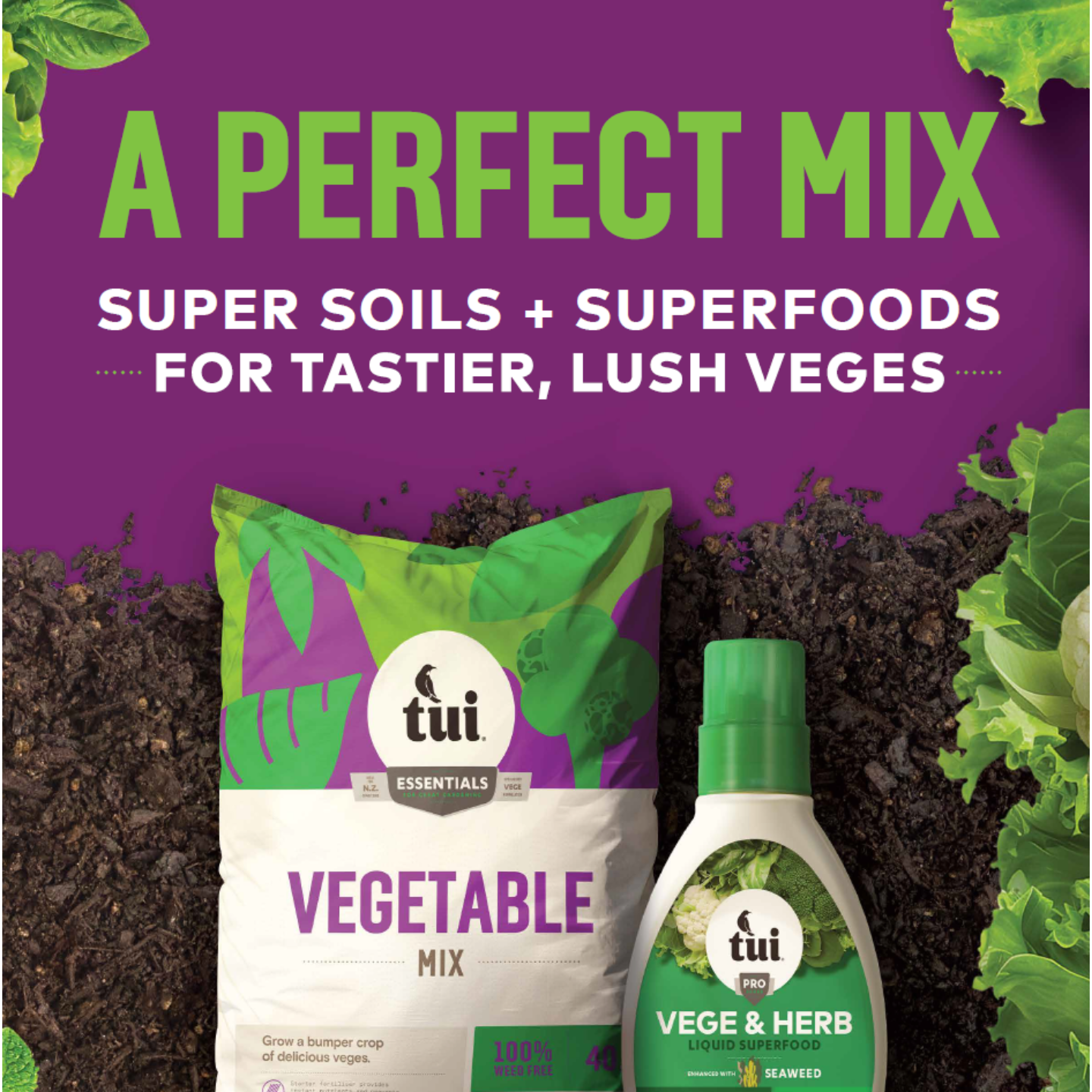 - The other into Tui Vegetable Mix - a premium blend loaded with nutrients - and later fed with Tui Vege & Herb Liquid Superfood.