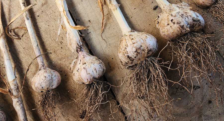 Cure garlic by hanging the bulbs in a well-ventilated area, and store in a cool, dry spot once dried.