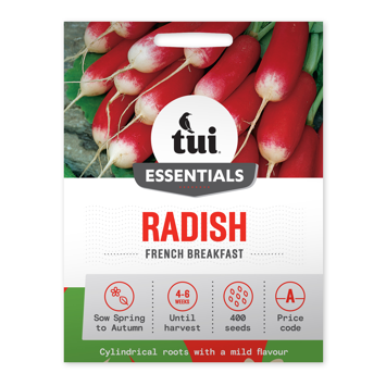 Tui Radish Seed - French Breakfast is quick to mature, producing long red cylindrical roots with a mild flavour and crisp texture. Their narrow tops help save space in the garden.