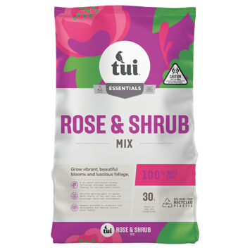 Rambling roses or perfectly pruned shrubbery - whatever your plant of choice may be, filling your piece of paradise with fragrant blooms and luscious vegetation will bring joy on a daily basis. Tui Rose & Shrub Mix is a high quality planting mix containing the right blend of nutrients to provide your roses and shrubs with the best possible start and sustained growth. This mix is also suitable for planting fruit trees. Added seaweed extract stimulates root development whilst improving overall plant health and SaturAid ensures water is channelled directly to the roots.
