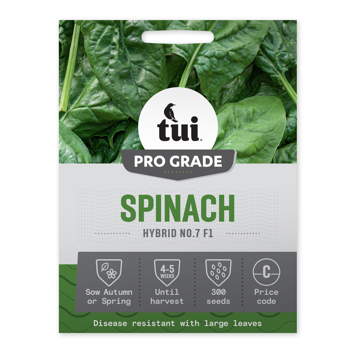 Tui Spinach Seed - Hybrid No7 F1 is a disease resistant variety that produces large leaves and prefers the cooler weather. Pick baby leaves for salads and larger leaves for steaming in cooking.