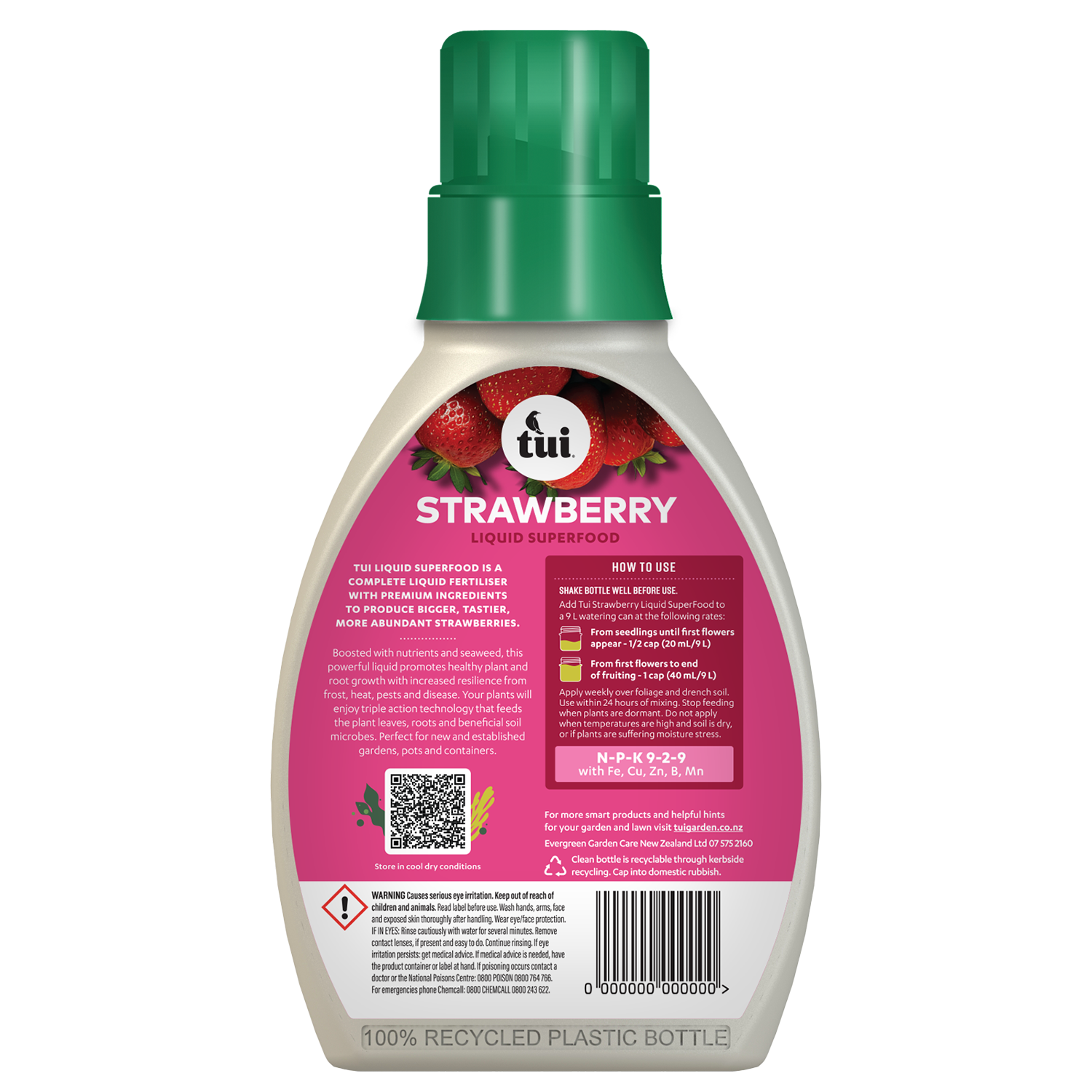 Tui Strawberry Liquid Superfood is a complete Liquid Fertiliser with premium ingredients to produce bigger, tastier, more abundant strawberries.