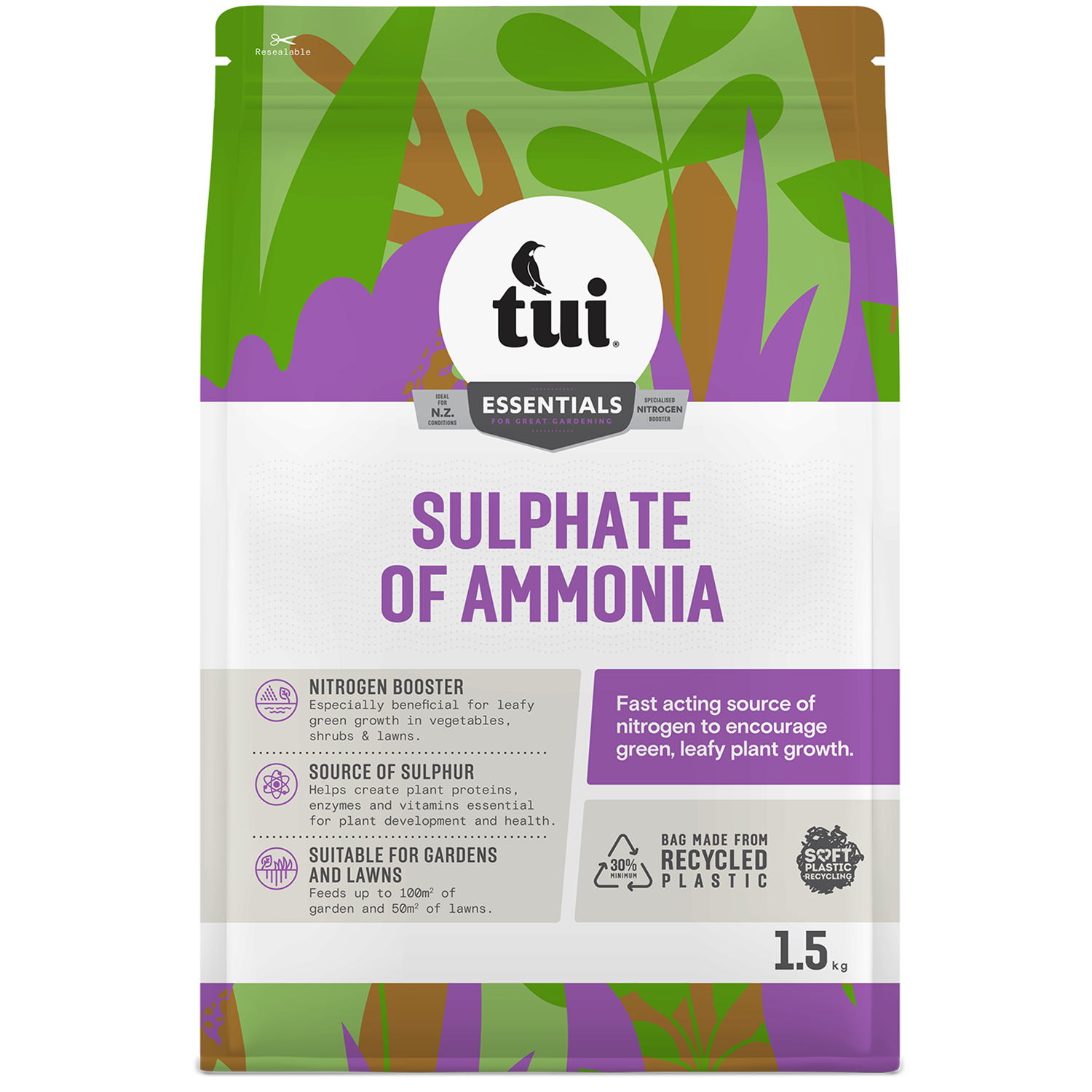 Tui Sulphate of Ammonia is a fast-acting source of nitrogen, essential for encouraging green, leafy plant growth. Nitrogen is particularly important when growing leafy vegetables, shrubs and lawns. The inclusion of sulphur encourages general plant health and improved flavour in vegetables.