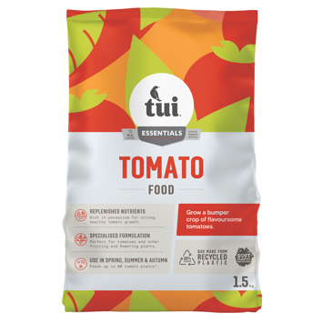 Tui Tomato Food is a blend of nitrogen, phosphorus and a generous amount of potassium, formulated to promote the growth and fruit potential of all types of tomatoes. Adding Tui Tomato Food during the growing season will replace nutrients taken from the soil and ensure you get the most out of your tomato plants.